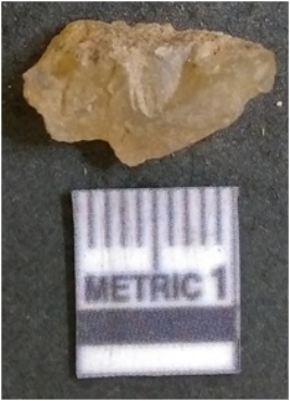 | Description / विवरण | It is chalcedony flake, translucent in appearance. The piece shows sharp pointed ends and flake scars on the surface as a result of flaking. The piece shows a bulb of percussion. |