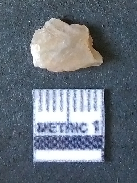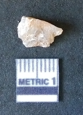 | Description / विवरण | The quartz piece is white in colour, semi-transparent, and with an uneven fracture pattern. The piece has prominent bulb of percussion and points at lithic knapping activity. |