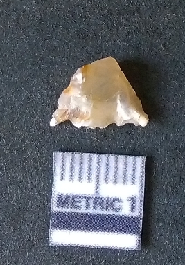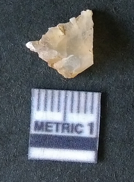 | Description / विवरण | The chalcedony piece is small, with yellowish coloration and flaked edges. The piece has rounded edges and has a prominent bulb of percussion as a result of flaking activity. |