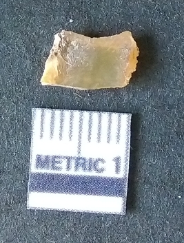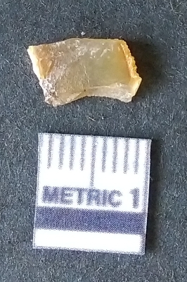 | Description / विवरण | The chalcedony piece is small, with yellowish coloration and flaked edges. The piece has rounded edges and has a prominent bulb of percussion as a result of flaking activity. |