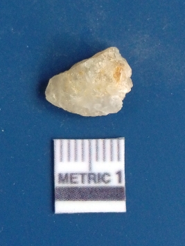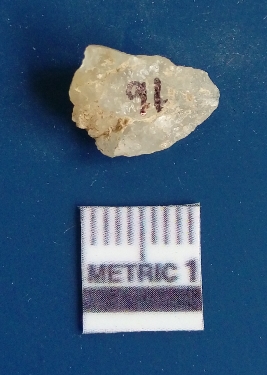 | Description / विवरण | The quartz flake has sharp flaked edges and pointed ends as a result of flaking. The piece is semi-transparent in nature with irregular fracture pattern. The piece is roughly triangular in shape and has a prominent bulb of percussion. |