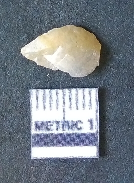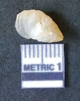 | Description / विवरण | The chalcedony piece is small, with yellowish coloration and flaked edges. The piece has rounded edges and has a prominent bulb of percussion as a result of flaking activity. |