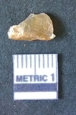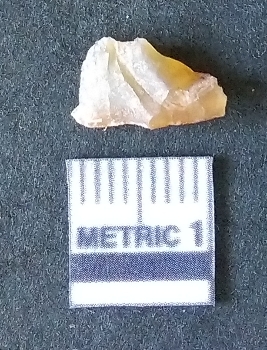 | Description / विवरण | The chalcedony piece is small, with yellowish coloration and flaked edges. The piece has rounded edges and has a prominent bulb of percussion as a result of flaking activity. |