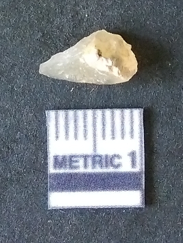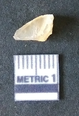 | Description / विवरण | The chalcedony piece is small, with yellowish coloration and flaked edges. The piece has rounded edges and has a prominent bulb of percussion as a result of flaking activity. |