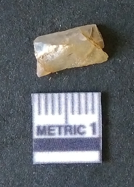 | Description / विवरण | The chalcedony piece is small, with yellowish coloration and flaked edges. The piece has rounded edges and has a prominent bulb of percussion as a result of flaking activity. |