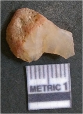 | Description / विवरण | The quartz flake has sharp flaked edges and pointed ends as a result of flaking. The piece is semi-transparent in nature with irregular fracture pattern. The piece is roughly triangular in shape and has a prominent bulb of percussion. |