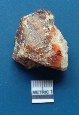 | Description / विवरण | The agate piece is translucent in appurtenance, with angular flaked edges and a bulb of percussion. The piece shows flake scars on the surface. |