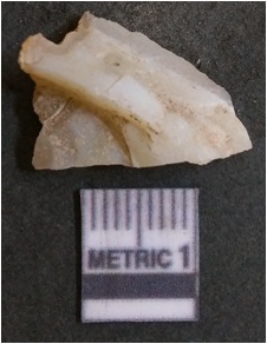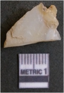 | Description / विवरण | The quartz flake has sharp flaked edges and pointed ends as a result of flaking. The piece is semi-transparent in nature with irregular fracture pattern. The piece is roughly triangular in shape and has a prominent bulb of percussion. |