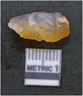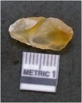 | Description / विवरण | It is chalcedony flake, translucent in appearance. The piece shows sharp pointed ends and flake scars on the surface as a result of flaking. The piece shows a bulb of percussion. |