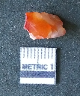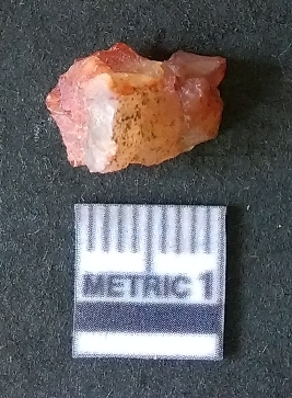 | Description / विवरण | The carnelian piece is red in colour, with crypto-crystalline matrix and flake scars on the surface due to flaking. The piece is a part of lithic knapping lithic manufacture and a part of secondary flaking. |