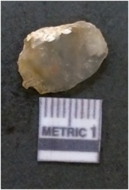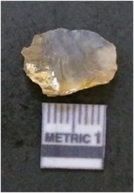 | Description / विवरण | It is chalcedony flake, translucent in appearance. The piece shows sharp pointed ends and flake scars on the surface as a result of flaking. The piece shows a bulb of percussion. |