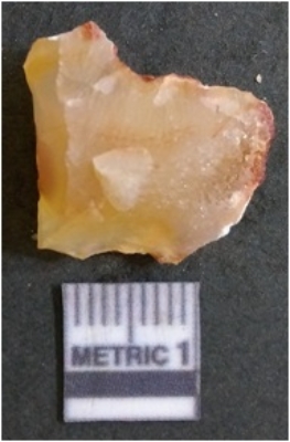 | Description / विवरण | It is chalcedony flake, translucent in appearance. The piece shows sharp pointed ends and flake scars on the surface as a result of flaking. The piece shows a bulb of percussion. |