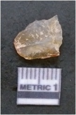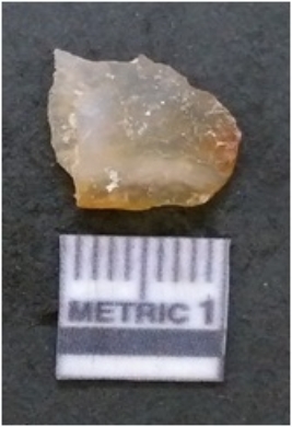 | Description / विवरण | It is chalcedony flake, translucent in appearance. The piece shows sharp pointed ends and flake scars on the surface as a result of flaking. The piece shows a bulb of percussion. |