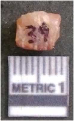 | Description / विवरण | It is chalcedony flake, translucent in appearance. The piece shows sharp pointed ends and flake scars on the surface as a result of flaking. The piece shows a bulb of percussion. |