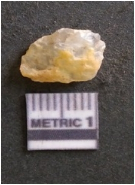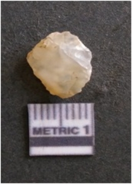 | Description / विवरण | It is chalcedony flake, translucent in appearance. The piece shows sharp pointed ends and flake scars on the surface as a result of flaking. The piece shows a bulb of percussion. |