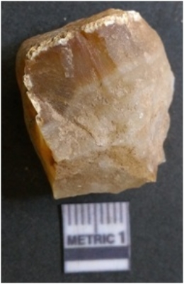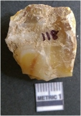 | Description / विवरण | It is chalcedony flake, translucent in appearance. The piece shows sharp pointed ends and flake scars on the surface as a result of flaking. The piece shows a bulb of percussion. |