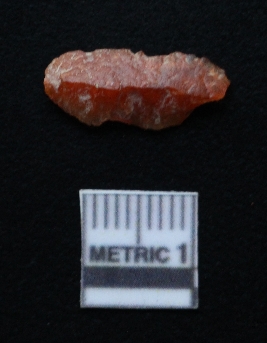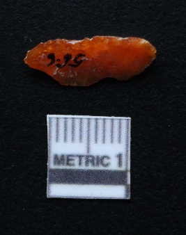 | Description / विवरण | The quartz piece is flat, triangular in shape and white in appearance. The piece has sharp flaked ends. The piece shows a prominent bulb of percussion and ripple marks on the surface as a result of flaking. |