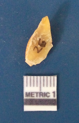 | Description / विवरण | It is chalcedony flake, translucent in appearance. The piece shows sharp pointed ends and flake scars on the surface as a result of flaking. The piece shows a bulb of percussion. |