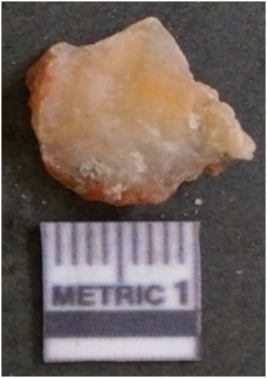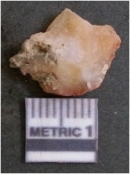 | Description / विवरण | It is chalcedony flake, translucent in appearance. The piece shows sharp pointed ends and flake scars on the surface as a result of flaking. The piece shows a bulb of percussion. |