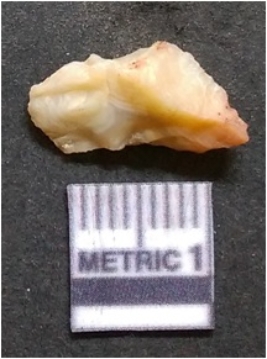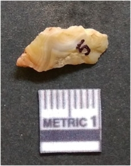 | Description / विवरण | The banded agate piece is crystalline in nature, with a smooth fracture pattern and visible bands on the flaked sides. The piece is pale in color and has sharp flaked ends. |