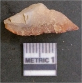 | Description / विवरण | It is chalcedony flake, translucent in appearance. The piece shows sharp pointed ends and flake scars on the surface as a result of flaking. The piece shows a bulb of percussion. |