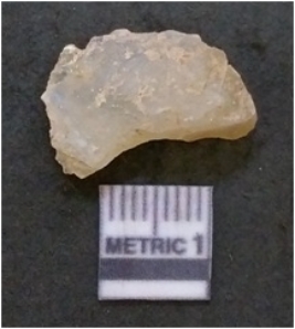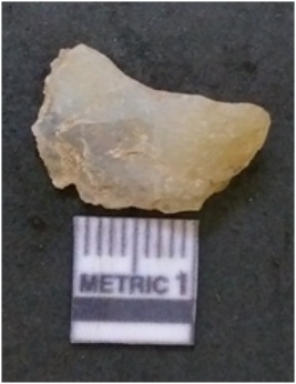 | Description / विवरण | It is chalcedony flake, translucent in appearance. The piece shows sharp pointed ends and flake scars on the surface as a result of flaking. The piece shows a bulb of percussion. |