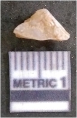 | Description / विवरण | The quartz flake has sharp flaked edges and pointed ends as a result of flaking. The piece is semi-transparent in nature with irregular fracture pattern. The piece is roughly triangular in shape and has a prominent bulb of percussion. |