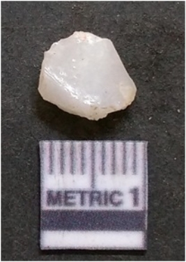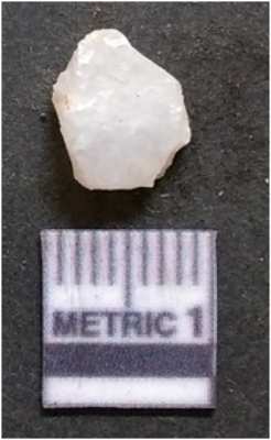 | Description / विवरण | The quartz flake has sharp flaked edges and pointed ends as a result of flaking. The piece is semi-transparent in nature with irregular fracture pattern. The piece is roughly triangular in shape and has a prominent bulb of percussion. |