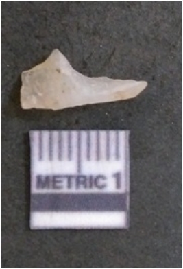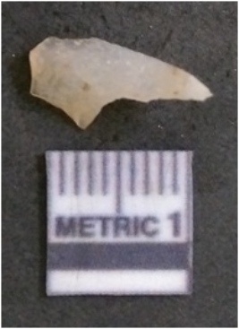 | Description / विवरण | The quartz flake has sharp flaked edges and pointed ends as a result of flaking. The piece is semi-transparent in nature with irregular fracture pattern. The piece is roughly triangular in shape and has a prominent bulb of percussion. |