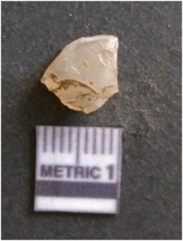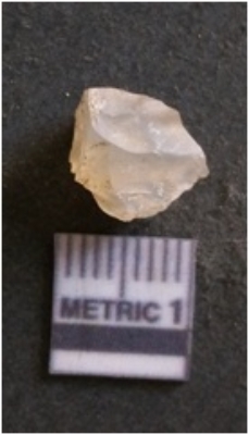 | Description / विवरण | It is chalcedony flake, translucent in appearance. The piece shows sharp pointed ends and flake scars on the surface as a result of flaking. The piece shows a bulb of percussion. |