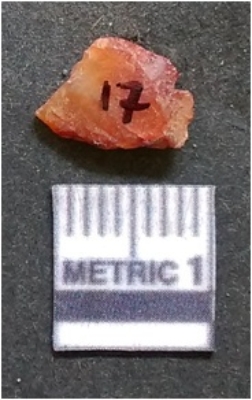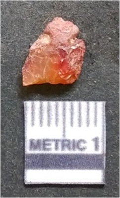 | Description / विवरण | It is carnelian flake red in color, with sharp flakes edges and a small bulb of percussion owing to knapping activity. The piece has sharp flaked edges and a crypto-crystalline matrix. |