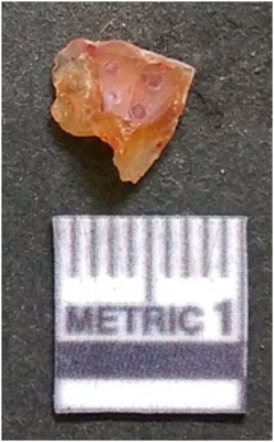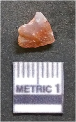 | Description / विवरण | It is carnelian flake red in color, with sharp flakes edges and a small bulb of percussion owing to knapping activity. The piece has sharp flaked edges and a crypto-crystalline matrix. |