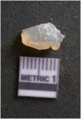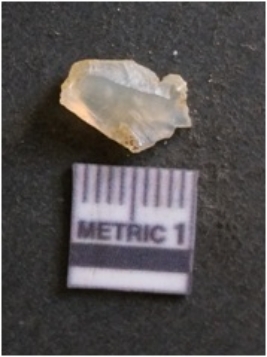| Description / विवरण | It is chalcedony flake, translucent in appearance. The piece shows sharp pointed ends and flake scars on the surface as a result of flaking. The piece shows a bulb of percussion. |