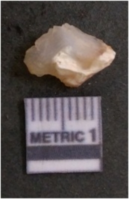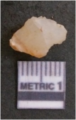 | Description / विवरण | The quartz flake has sharp flaked edges and pointed ends as a result of flaking. The piece is semi-transparent in nature with irregular fracture pattern. The piece is roughly triangular in shape and has a prominent bulb of percussion. |