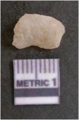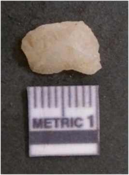 | Description / विवरण | The quartz flake has sharp flaked edges and pointed ends as a result of flaking. The piece is semi-transparent in nature with irregular fracture pattern. The piece is roughly triangular in shape and has a prominent bulb of percussion. |