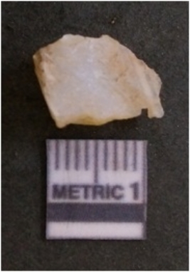 | Description / विवरण | The quartz flake has sharp flaked edges and pointed ends as a result of flaking. The piece is semi-transparent in nature with irregular fracture pattern. The piece is roughly triangular in shape and has a prominent bulb of percussion. |