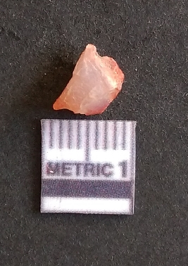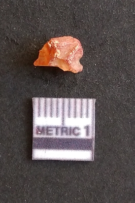 | Description / विवरण | The carnelian flake is reddish in color, with sharp flakes edges and a small bulb of percussion owing to knapping activity. |