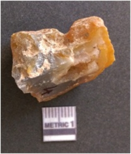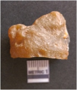 | Description / विवरण | The flake has irregular fracture pattern and sharp flaked edges as a result of lithic knapping activity. The piece is pale, with surfacial flake scars and a bulbous end. The flake is of smoky quartz variety, grayish in colour and translucent in appearance. |