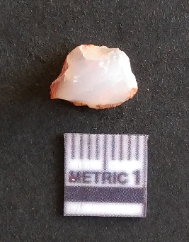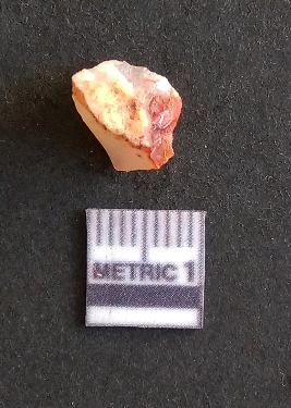 | Description / विवरण | The carnelian flake is reddish in color, with sharp flakes edges and a small bulb of percussion owing to knapping activity. |