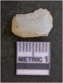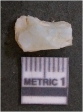 | Description / विवरण | The quartz flake has sharp flaked edges and pointed ends as a result of flaking. The piece is semi-transparent in nature with irregular fracture pattern. The piece is roughly triangular in shape and has a prominent bulb of percussion. |
