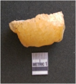 | Description / विवरण | The quartz flake has sharp flaked edges and pointed ends as a result of flaking. The piece is semi-transparent in nature with irregular fracture pattern. The piece is roughly triangular in shape and has a prominent bulb of percussion. |