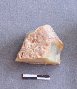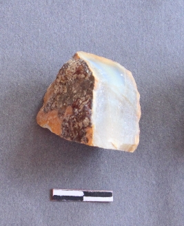 | Description / विवरण | It is lithic debitage fragment have sharp mid ridges and sharp edges as a result of flaking. It is agate chunks with cortex on one side. |