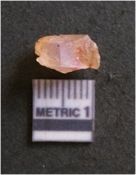 | Description / विवरण | It is chalcedony flake, translucent in appearance. The piece shows sharp pointed ends and flake scars on the surface as a result of flaking. The piece shows a bulb of percussion, and on the verse of turning to carnelian due to applied heat. |