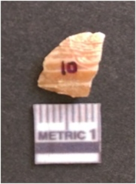 | Description / विवरण | The banded agate piece is crystalline in nature, with a smooth fracture pattern and visible bands on the flaked sides. The piece is pale in color and has sharp flaked ends. |