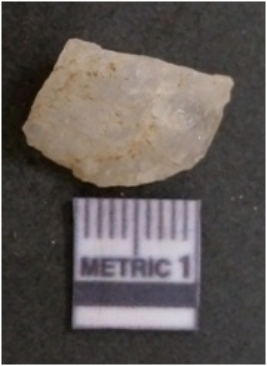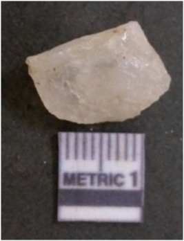 | Description / विवरण | The quartz flake has sharp flaked edges and pointed ends as a result of flaking. The piece is semi-transparent in nature with irregular fracture pattern. The piece is roughly triangular in shape and has a prominent bulb of percussion. |