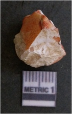 | Description / विवरण | The quartz flake has sharp flaked edges and pointed ends as a result of flaking. The piece is semi-transparent in nature with irregular fracture pattern. The piece is roughly triangular in shape and has a prominent bulb of percussion. |