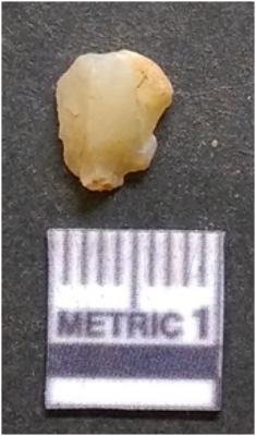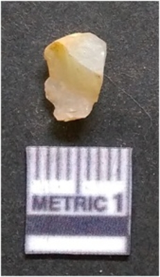 | Description / विवरण | It is chalcedony flake, translucent in appearance. The piece shows sharp pointed ends and flake scars on the surface as a result of flaking. The piece shows a bulb of percussion. |