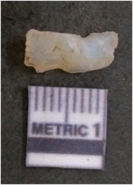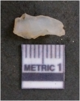 | Description / विवरण | It is chalcedony flake, translucent in appearance. The piece shows sharp pointed ends and flake scars on the surface as a result of flaking. The piece shows a bulb of percussion. |
