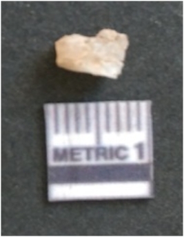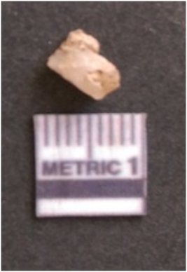 | Description / विवरण | The quartz flake has sharp flaked edges and pointed ends as a result of flaking. The piece is semi-transparent in nature with irregular fracture pattern. The piece is roughly triangular in shape and has a prominent bulb of percussion. |