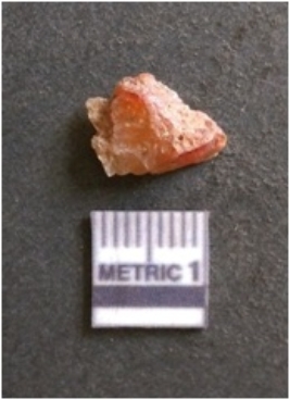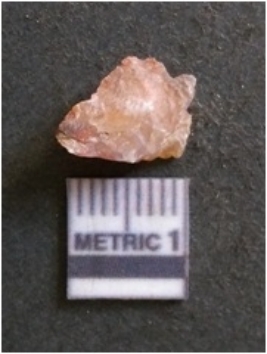 | Description / विवरण | It is chalcedony flake, translucent in appearance. The piece shows sharp pointed ends and flake scars on the surface as a result of flaking. The piece shows a bulb of percussion, and on the verse of turning to carnelian due to applied heat. |